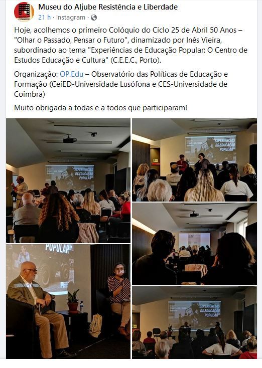 The first Colloquium of the Cycle April 25 50 Years: Looking into the Past, Thinking about the Future took place on October 27. Hosted by the Aljube Museum – Resistance and Freedom and directed by Inês Vieira, in this first meeting we talked about Experiences of Popular Education: The Education and Culture Study Center (C.E.E.E.C., Porto) with José Ferreira, a member of the C.E.E.C. during the democratic transition period.